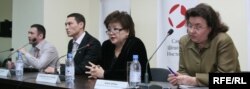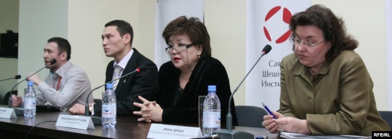 Оңнан солға қарай: Саяси шешімдер институтының сарапшылары Ирина Черных, Бақытжамал Бектұрғанова, Санжар Боқаев және Алмас Садықов. Алматы, 15 желтоқсан 2009 жыл.