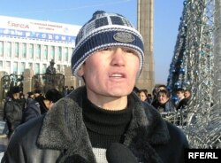 Жандос Бердімбетов 2009 жылы 16 желтоқсан күні Қазақстанның туын ұстап Республика алаңына келе жатқанда өзін полиция ұстап әкеткенін айтады. Алматы, 17 желтоқсан 2009 жыл.