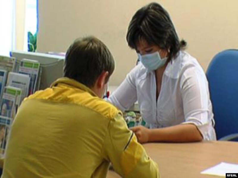«Казкоммерцбанктың» Петропавлдағы бөлімшесінің қызметкері бетперде тағып жұмыс істеуде. 6 тамыз 2009 жыл.