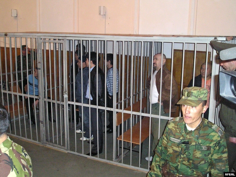 Қоғамдық қорғаушы Жасарал Қуанышәлин (ортада) залдағы орындарға отырып алған құқық органдарының қызметкерлерінен орынды айыпкерлердің сыртта қалған туыстарына босатуды талап етіп тұр. Алматы, 5 қазан 2007 жыл.