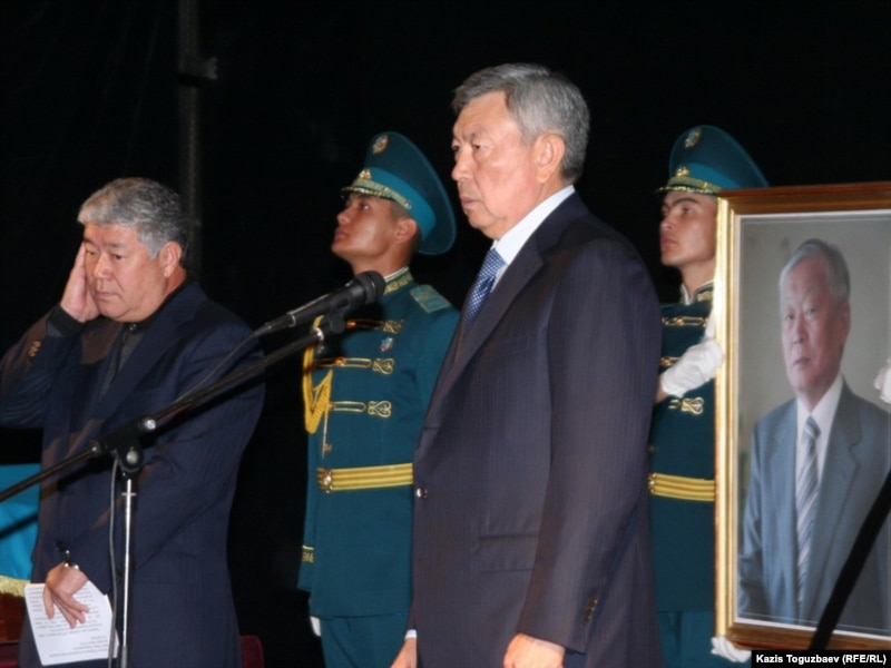 Алматы қаласының әкімі Ахметжан Есімов (сол жақта) пен ҰҚК төрағасы Нұртай Әбіқаев (оң жақта) Владимир Нимен қоштасуға арналған қаралы жиында. Алматы, 12 қыркүйек 2010 жыл.