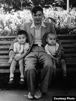 Ермұқан Бекмаханов ұлдары Ерік пен Серікті құшақтап отыр. Алматы, 1952 жыл