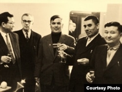 Ермұқан Бекмаханов (ортада) Низами атындағы Ташкент педагогикалық институтының директоры Абдуллаевтың диссертация қорғауынан соң. Жылы белгісіз