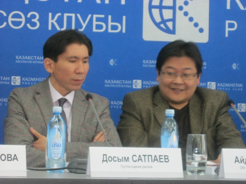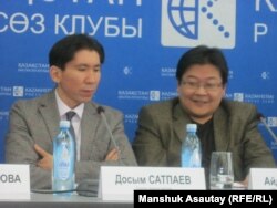 Досым Сәтпаев (Тәуекелді бағалау тобының жетекшісі) және Айдос Сарым (А.Сәрсенбайұлы қорының басшысы). Алматы, 9 наурыз 2011 жыл